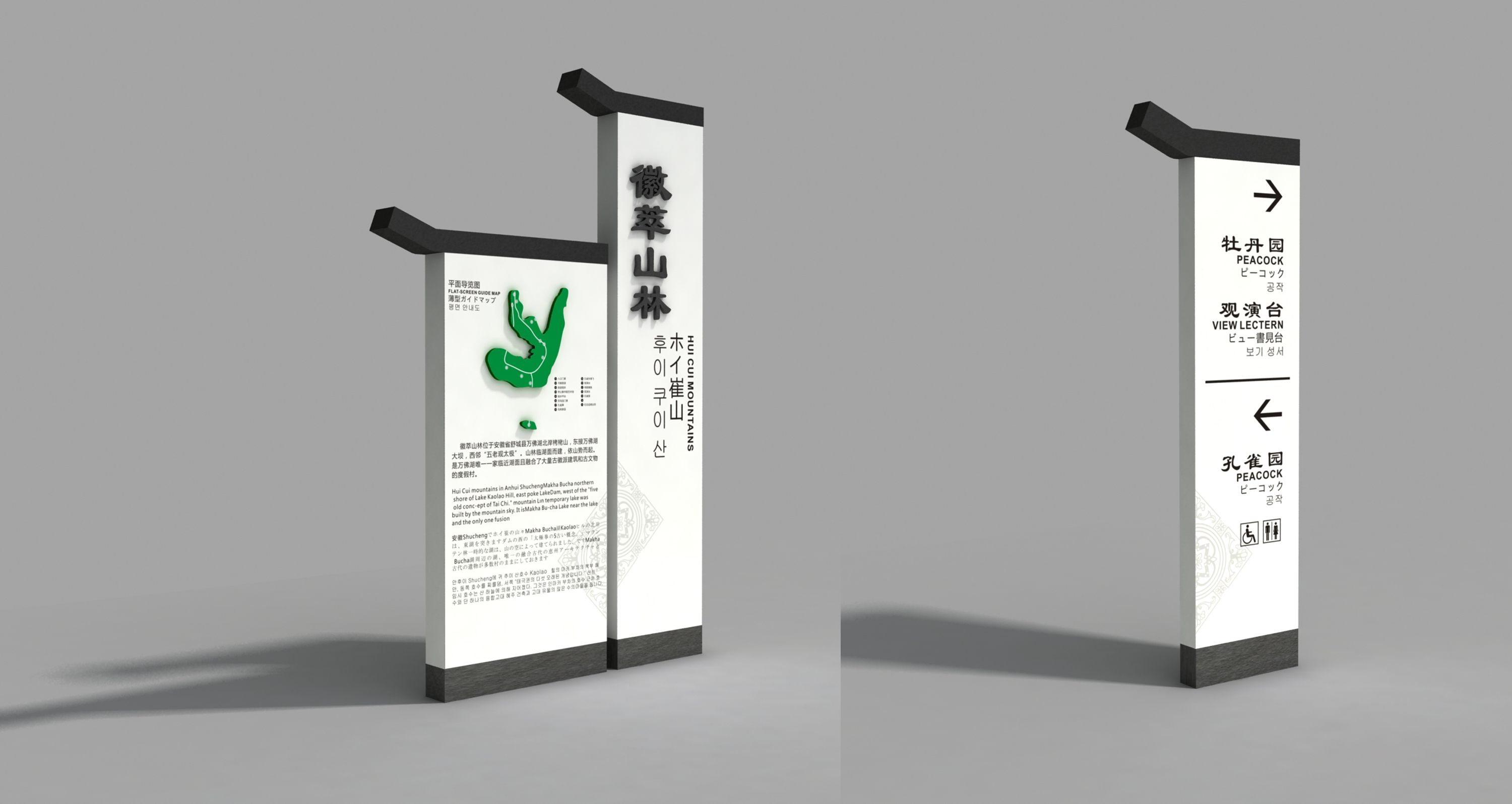 我們在標識設計時首先從游客角度出發(fā),對景區(qū)內各個景點、公共設施及服務設施的方位及線路進行分析,在保證景區(qū)標識牌識別功能的前提下,讓標識形式風格及材料選用等都應盡可能同周圍環(huán)境相協(xié)調并強調網絡性、系統(tǒng)性、統(tǒng)一性。