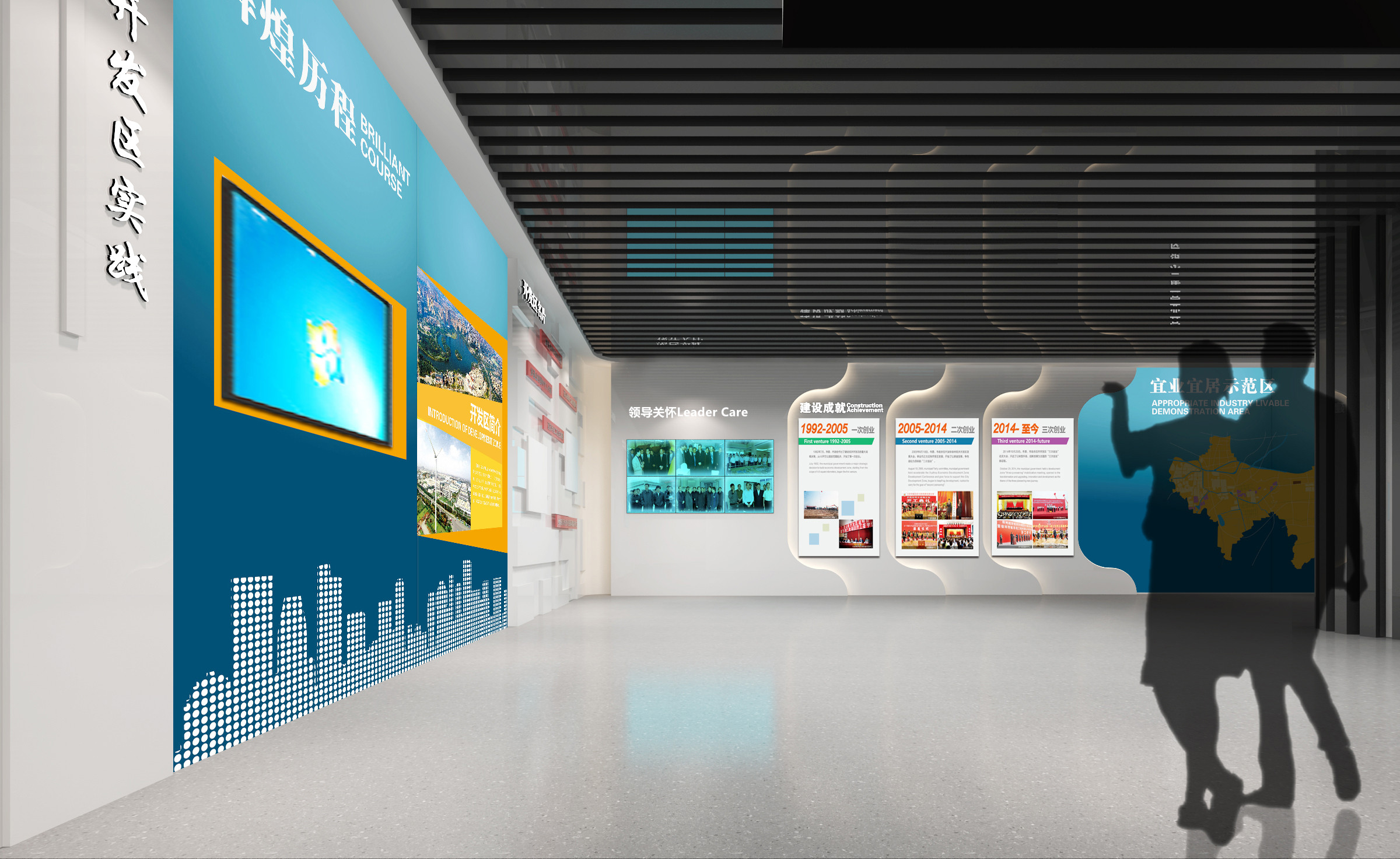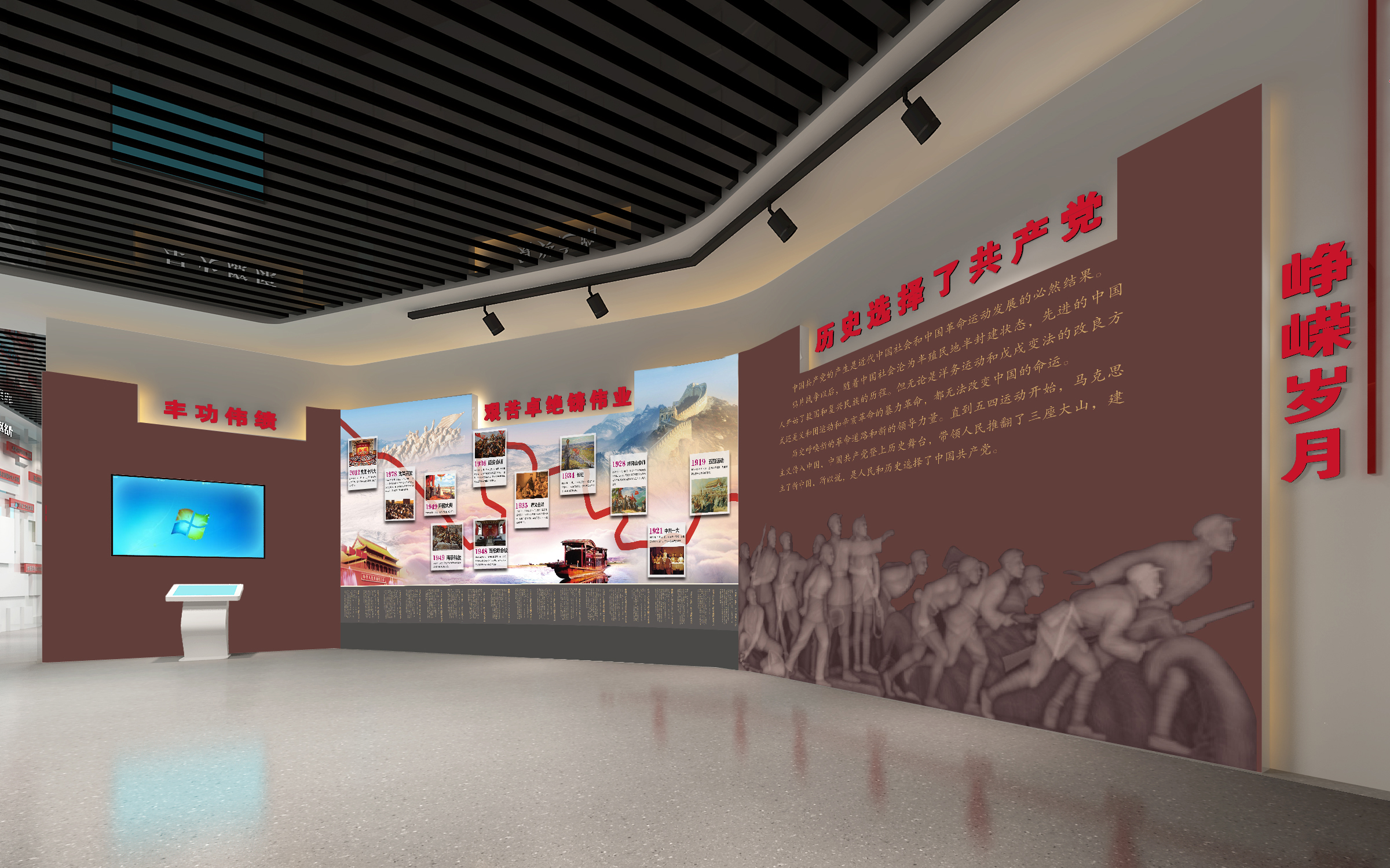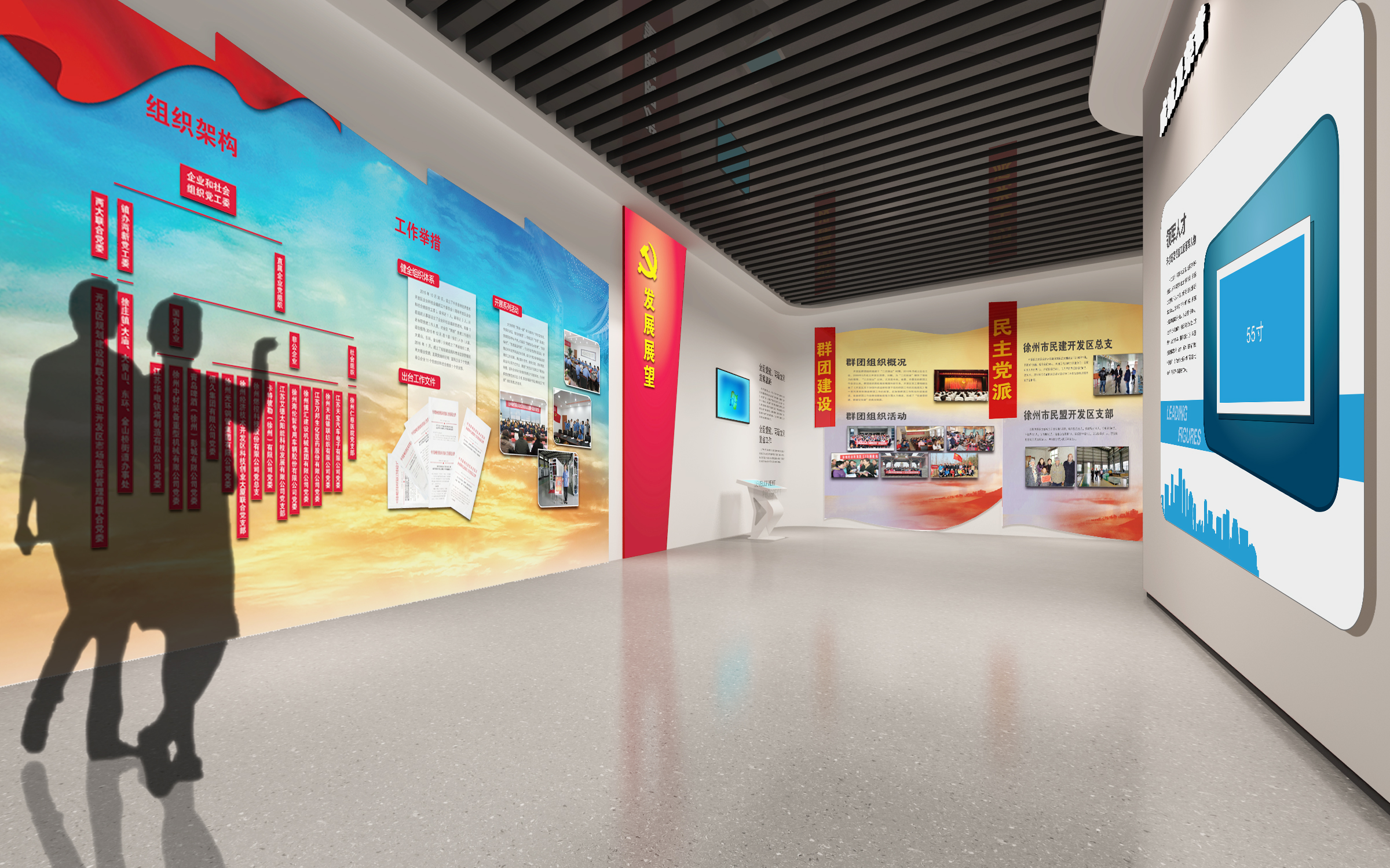 其中布展建筑面積約880平方米,共分為序廳、薪火相傳、開發(fā)區(qū)實踐、黨的建設、黨群建設等五部分,用流暢緊湊的參觀流線,系統(tǒng)展示徐州經(jīng)濟開發(fā)區(qū)全面貫徹黨的精神,緊緊圍繞“三次創(chuàng)業(yè)”的發(fā)展戰(zhàn)略,努力建設“經(jīng)濟強、百姓富、環(huán)境美、社會文明程度高”的升級版的國家級開發(fā)區(qū)的輝煌前景。另外配套設置了主題展廳、圖書閱覽室、黨員“創(chuàng)客”夢吧、群團活動中心、心靈驛站、黨員教育室、遠程教育室、接待室、咖啡吧、便民超市、辦公室、檔案室、流動黨員活動站、多功能廳等空間。