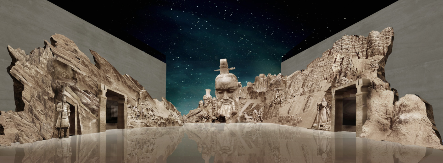 咸陽,作為中國歷史上的首座帝都,見證了秦帝國的榮耀與衰亡,更是華夏文明崛起的出發(fā)點。咸陽博物院序廳的設(shè)計將動態(tài)氛圍投影與靜態(tài)的雕像群相結(jié)合,創(chuàng)作出一組極具視覺沖擊的雕像群,秦文化節(jié)點人物與事件躍然其上,雕像與投影的動靜結(jié)合,開啟一場盛大的感官體驗。