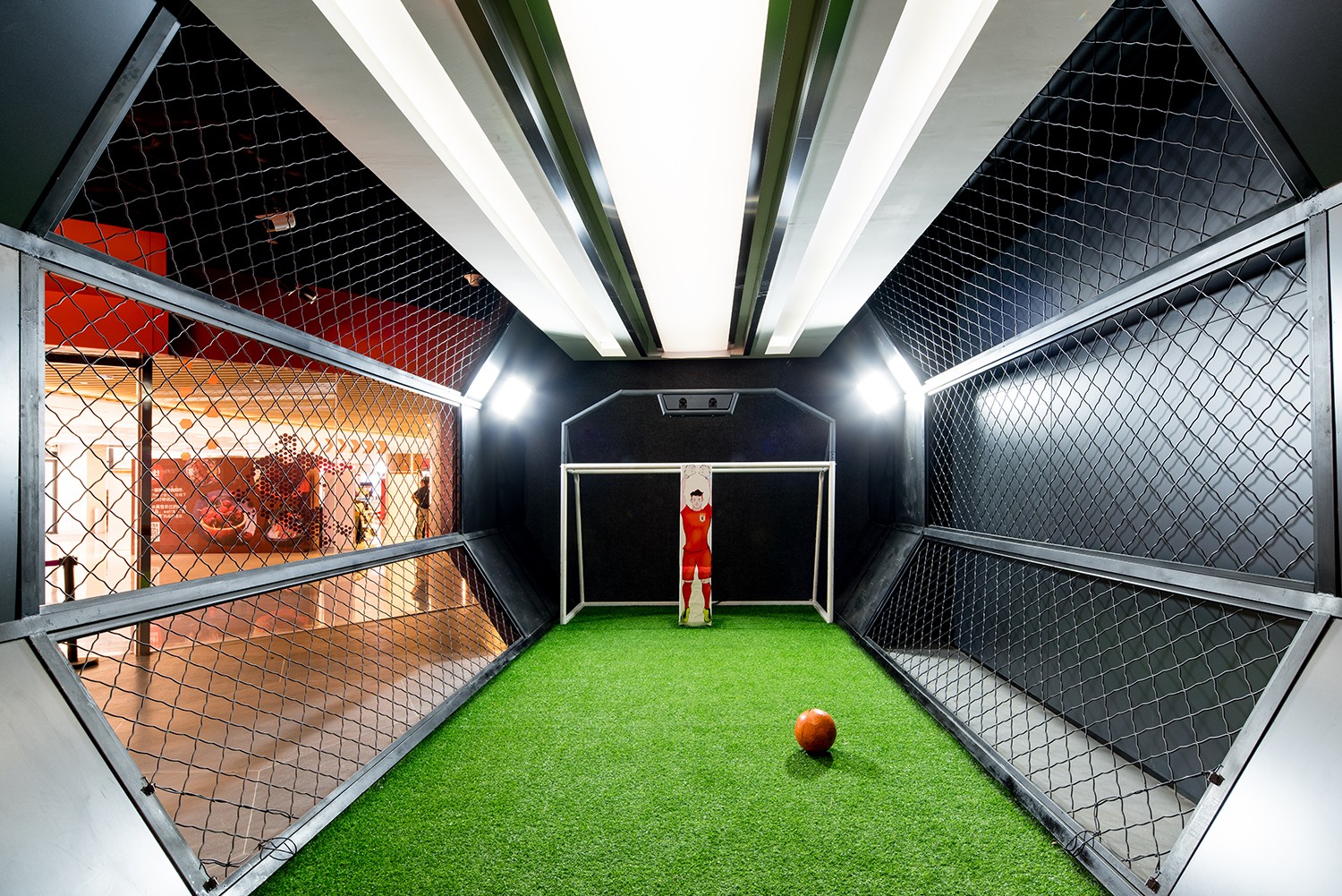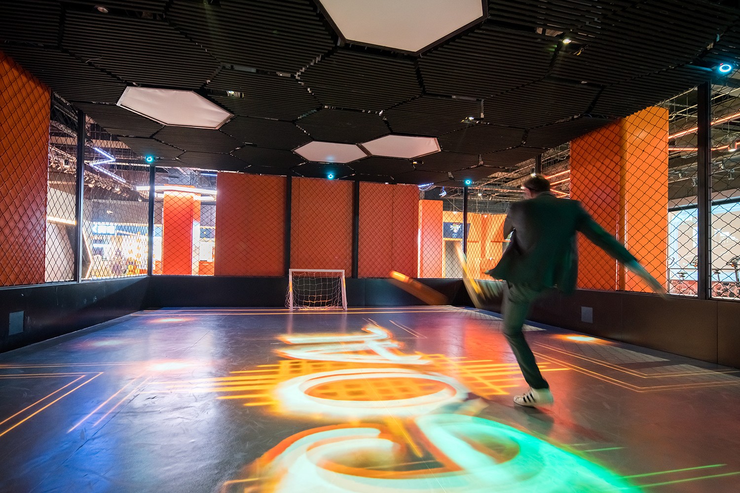 為保證小將館運(yùn)營效益,蘇州金螳螂文化發(fā)展股份有限公司在保證足球主題及空間語言的前提下,調(diào)研分析場館定位受眾,結(jié)合中國市場特性,對小將館所有展項(xiàng)進(jìn)行創(chuàng)新、提升,打造出一個不僅可以在虛擬、互動中體驗(yàn)滑雪、田徑、騎行、乒乓球、攀巖等多項(xiàng)目,并且能以全新視野和超炫酷的娛樂方式與親朋好友約戰(zhàn)的高科技運(yùn)動館。