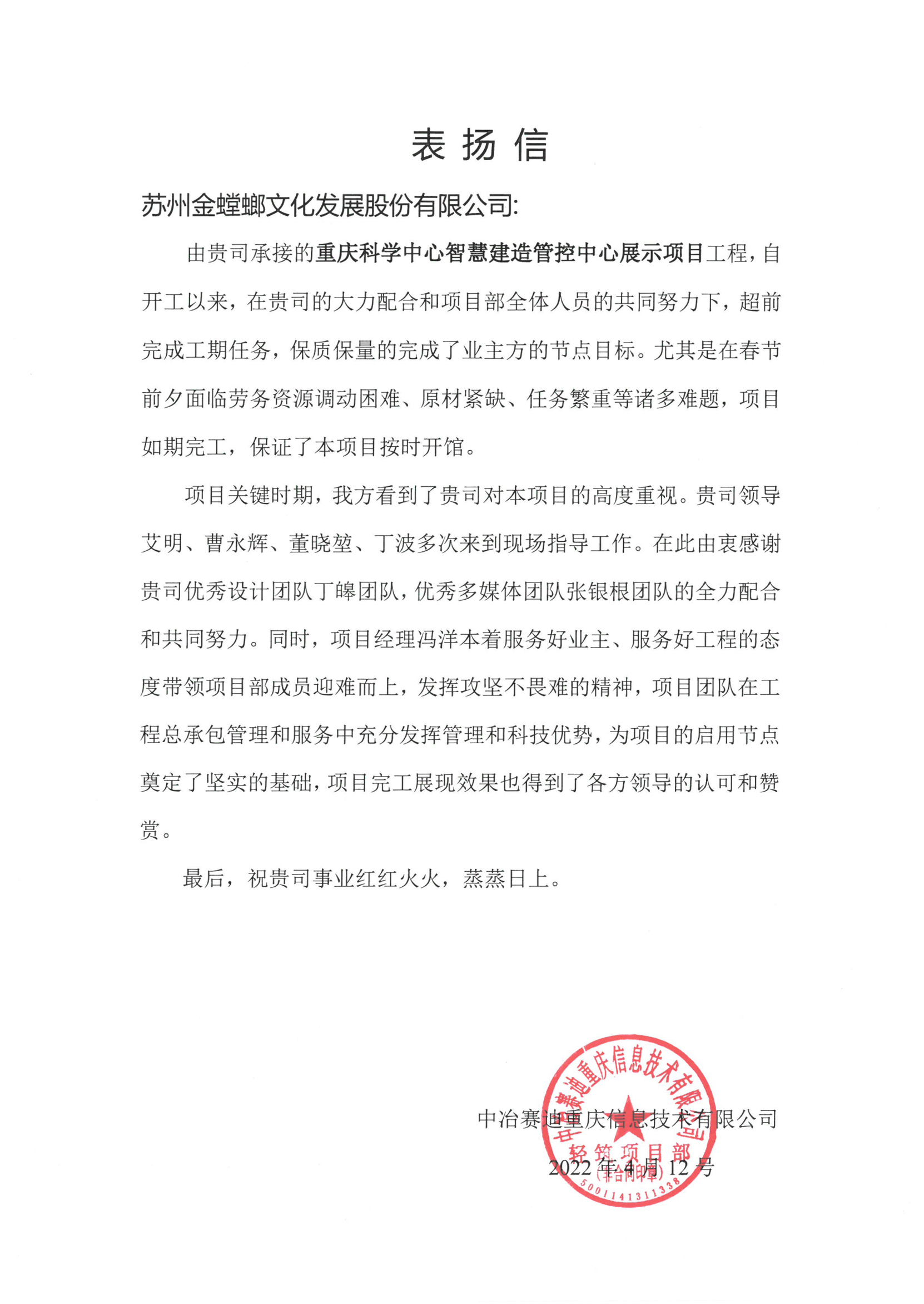 虎峰山下,科技之光閃耀巴渝 中國科學(xué)院重慶科學(xué)中心 智慧建造管控中心展廳 金螳螂文化出品 Smart Construction Control Center? (視頻) 中國科學(xué)院重慶科學(xué)中心由重慶市政府與中國科學(xué)院共同打造,聚焦大數(shù)據(jù)智能化、生物醫(yī)學(xué)、新材料、生態(tài)環(huán)境等研究攻關(guān)方向,規(guī)劃建設(shè)硅基光技術(shù)研究院、生物醫(yī)學(xué)數(shù)據(jù)科學(xué)研究中心等專業(yè)研究機構(gòu)。 4月上旬,重慶市副市長熊雪調(diào)研智慧建造管控中心 由金螳螂文化設(shè)計打造的重慶中科院智慧建造管控中心展廳分為企業(yè)廳、項目廳、共享廳三個展廳,從“展、控、演、感”四個方面詮釋中科院文化、中冶賽迪歷史軸線以及項目的數(shù)字化設(shè)計、施工、運維、多區(qū)域化管控等內(nèi)容。 項目建設(shè)過程中,為了更好地展示項目應(yīng)用的智慧工地、綠色施工、前沿技術(shù)等創(chuàng)新亮點,金螳螂文化項目團隊從空間布局、項目展示、交互體驗等方面著手,結(jié)合建設(shè)單位中冶賽迪智慧建造、綠色低碳等前沿創(chuàng)新技術(shù),打造項目必備的靈魂展示窗口。 中國科學(xué)院重慶科學(xué)中心將以大科學(xué)裝置和一流科技院所為依托,薈萃頂尖科技人才,打造世界知名的科學(xué)中心、人才匯聚的創(chuàng)新高地,點燃科技創(chuàng)新的火把,“照亮”科學(xué)之城的光明未來。 業(yè)主單位中冶賽迪向金螳螂文化發(fā)來表揚信 金螳螂文化持續(xù)深耕主題展示領(lǐng)域,以匠心打造重慶中科院智慧建造管控中心展廳,愿為科技之發(fā)展助力。