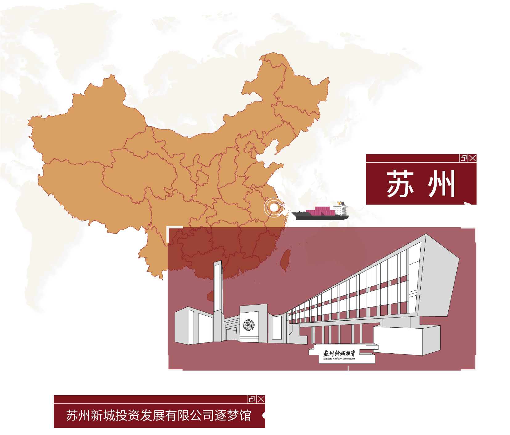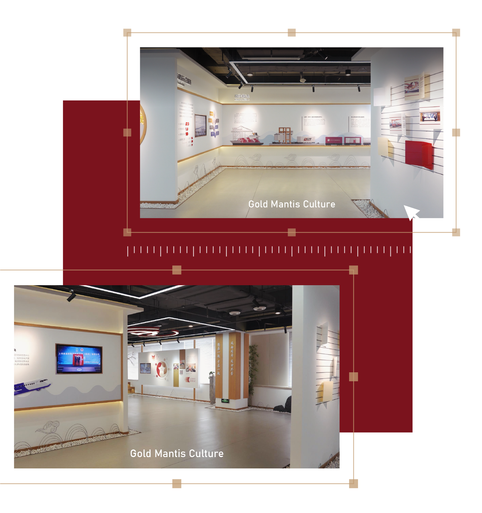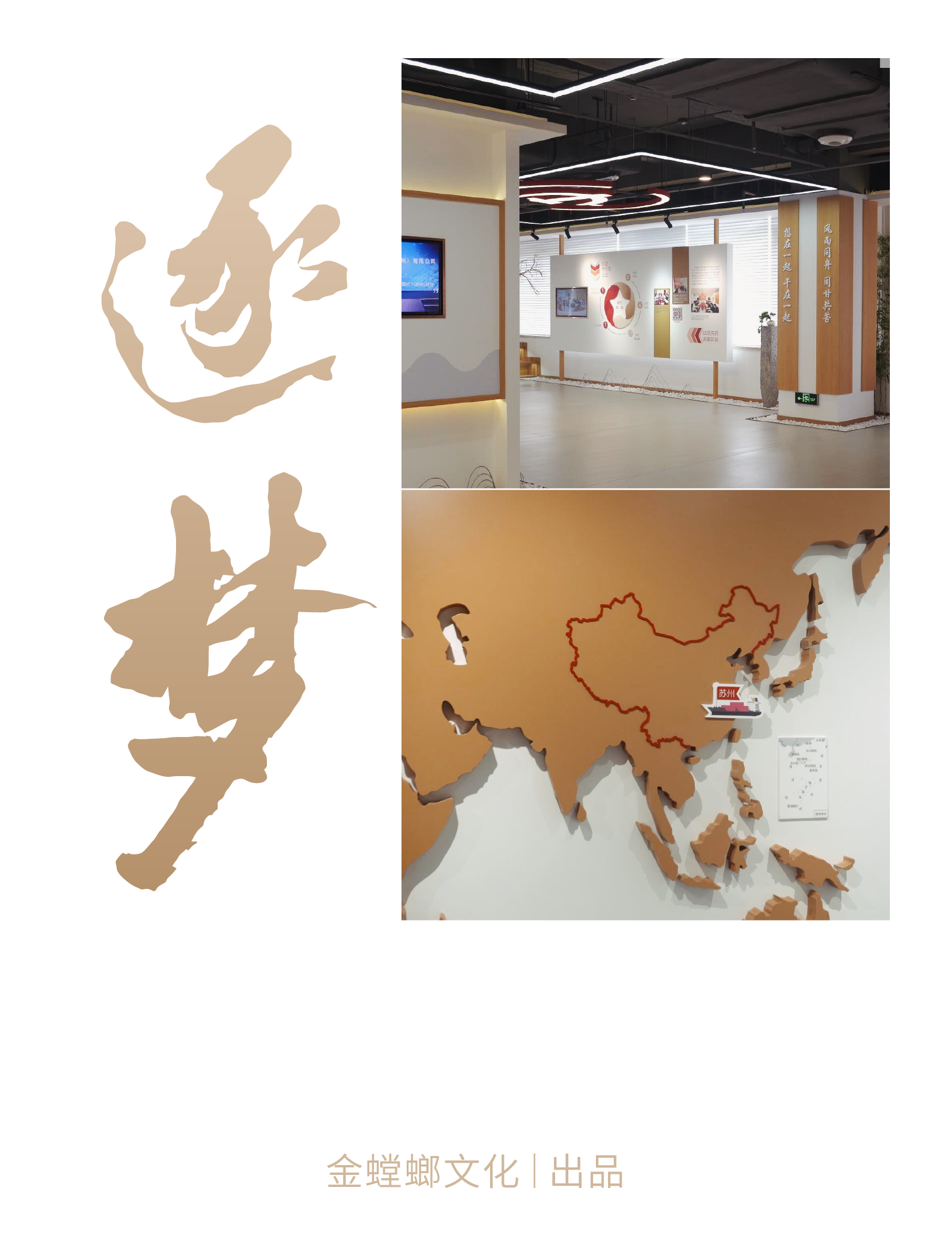 一輛輛貨車有序駛過 窗外物流中心各色集裝箱堆疊 在新城黨建綜合陣地 竹影搖曳,木色溫潤(rùn) 細(xì)細(xì)述說新城逐夢(mèng)發(fā)展之旅 蘇州新城投資發(fā)展有限公司是蘇州市國(guó)資委管理的市屬國(guó)有企業(yè)。 公司以姑蘇平江、滄浪、金閶三新城開發(fā)建設(shè)為起點(diǎn),積極搶抓“一帶一路”、長(zhǎng)江經(jīng)濟(jì)帶、長(zhǎng)三角區(qū)域一體化、自貿(mào)區(qū)等重大戰(zhàn)略疊加機(jī)遇,逐步形成城市建設(shè)、運(yùn)營(yíng)、服務(wù)和現(xiàn)代物流兩大主業(yè)。 金螳螂文化出品蘇州新城投資發(fā)展有限公司逐夢(mèng)館,承載黨的文化,延續(xù)并傳遞企業(yè)精神。 設(shè)計(jì)中融入中式元素與企業(yè)特色符號(hào),定制化呈現(xiàn)不一樣的黨建綜合陣地。 逐夢(mèng)館由序廳、主責(zé)主業(yè)、新城黨建、未來展望幾個(gè)部分組成,以鮮明的市黨委精神為主線,貫穿場(chǎng)館的理念、視覺、環(huán)境、行為、文化、構(gòu)建和諧統(tǒng)一的文化體系。 金螳螂文化設(shè)計(jì)團(tuán)隊(duì)通過分析蘇州市的地域文化和人文精神,風(fēng)土風(fēng)貌,從中挖掘所在地區(qū)的文化屬性。 創(chuàng)新設(shè)置時(shí)間軸互動(dòng)展項(xiàng),轉(zhuǎn)動(dòng)手柄即可直觀了解企業(yè)大事記,回顧企業(yè)發(fā)展歷程。 在介紹現(xiàn)代物流業(yè)版塊,運(yùn)用滑軌移動(dòng)屏清晰闡釋企業(yè)的業(yè)務(wù)構(gòu)成。 新城新起點(diǎn),共創(chuàng)新發(fā)展。從江南水鄉(xiāng)到三秦大地,金螳螂文化為博物館、規(guī)劃館、科技館、美術(shù)館、城市文化館、主題樂園、歷史街區(qū)等客戶提供空間環(huán)境藝術(shù)策劃、設(shè)計(jì)、多媒體與場(chǎng)景藝術(shù)創(chuàng)作、布展施工整體解決方案,詮釋空間故事,彰顯文化價(jià)值。