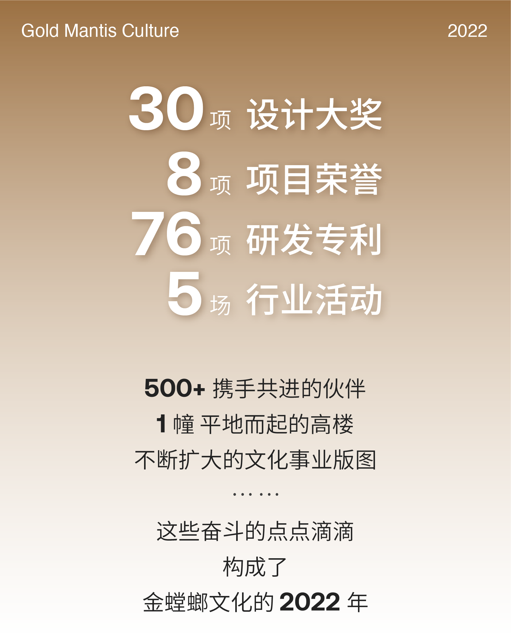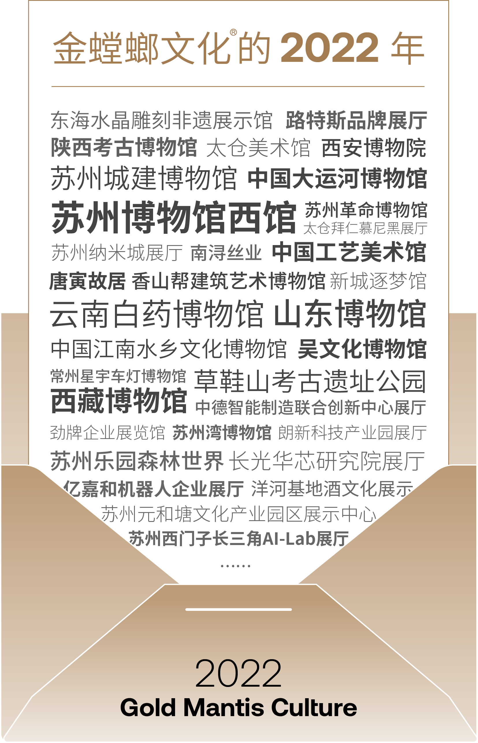 從江南水鄉(xiāng)到三秦大地,金螳螂文化詮釋空間故事,打造了數(shù)十個全國及各省市重點文化項目,收獲了近40個設(shè)計、施工類獎項,得到了業(yè)主認可,塑造了“創(chuàng)新質(zhì)造”的行業(yè)口碑。 5·18 國際博物館日,2021年度全國博物館十大陳列展覽精品終評結(jié)果公布。 金螳螂文化參與設(shè)計施工的“揚州中國大運河博物館常設(shè)展覽”喜獲第十九屆(2021年度)全國博物館十大陳列展覽精品獎! 常熟市沙家浜革命歷史紀(jì)念館改陳布展項目獲得2021-2022年度中國建筑工程裝飾獎。 溧陽生態(tài)創(chuàng)新展示館獲得2022年度建筑裝飾行業(yè)科學(xué)技術(shù)獎科技創(chuàng)新工程獎。 中國建筑裝飾設(shè)計獎、美國IDA設(shè)計大獎、加拿大GPD設(shè)計大獎……金螳螂文化項目的影響力不斷擴大,在實現(xiàn)企業(yè)價值增長的同時弘揚優(yōu)秀中華文化,讓文化會說話。 讓設(shè)計更有文化,讓空間更有故事。 多年來,金螳螂文化持續(xù)深度探索文化行業(yè),積極推動行業(yè)相關(guān)標(biāo)準(zhǔn)的編制,推動校企合作,推進產(chǎn)學(xué)研共建,愿做文化行業(yè)探索者。 努力會被看見,優(yōu)秀會得到嘉獎,金子終將閃閃發(fā)光。 在不完美的現(xiàn)實中,金螳螂文化人發(fā)現(xiàn)美,創(chuàng)造美,共同繪就文化的未來。 2022 這一年 我們銳意進取,榮耀相隨 在嶄新的 2023 年 愿突破想象,逐新再創(chuàng) 并肩前行,大展宏“兔” 共筑文化行業(yè)的未來!