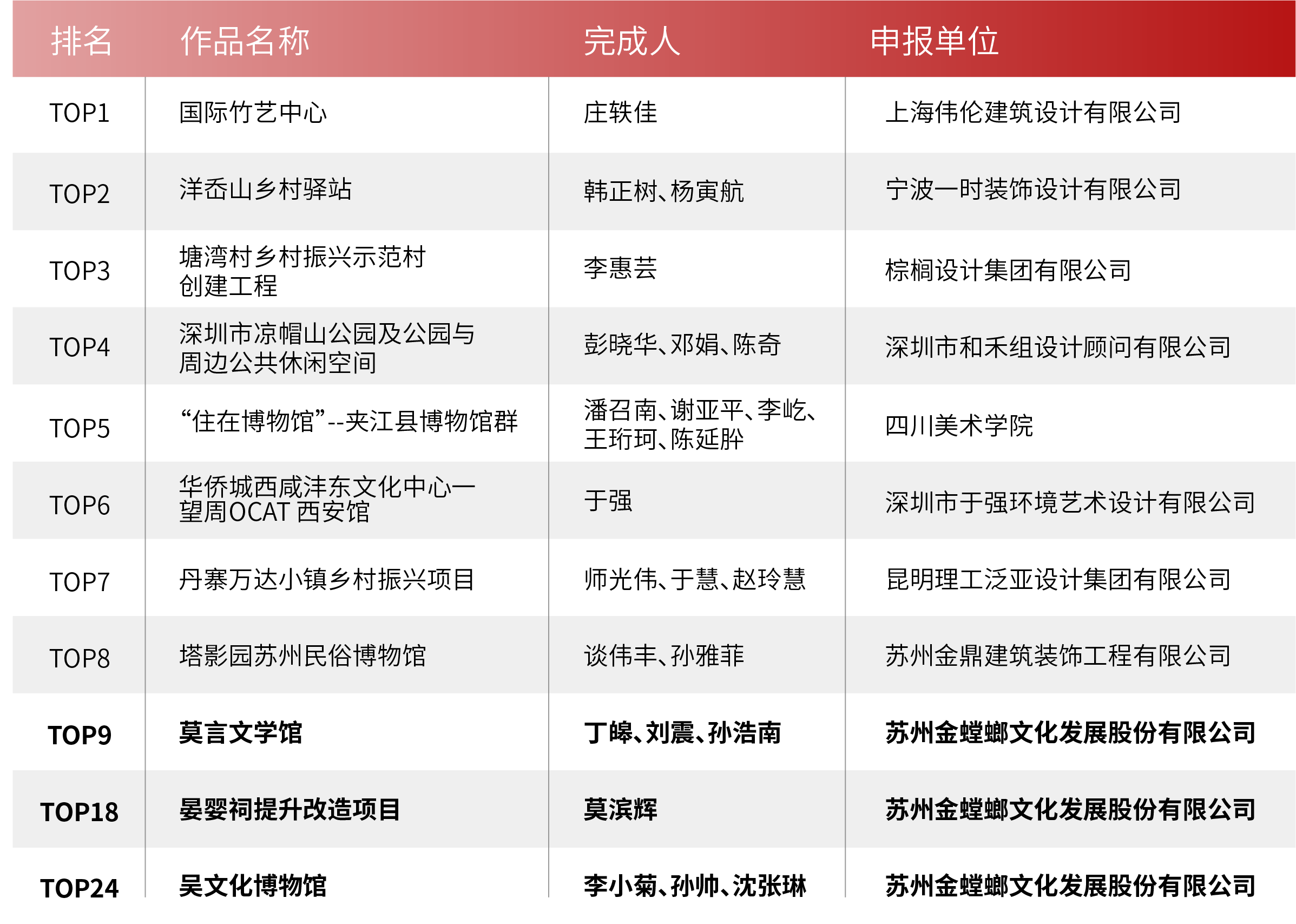2022年鄉(xiāng)村公共文化空間 設(shè)計展示活動 終評結(jié)果于近日公布 金螳螂文化再創(chuàng)佳績 獲評 最佳設(shè)計/運營機構(gòu) 3 個項目獲得 最美鄉(xiāng)村公共文化空間 (空間設(shè)計類) 為深入貫徹落實習(xí)近平總書記關(guān)于文化和旅游工作重要論述精神,持續(xù)發(fā)現(xiàn)和推出一批“美”“好”“新”的鄉(xiāng)村公共文化空間,引領(lǐng)新時代鄉(xiāng)村公共文化空間構(gòu)建,推動鄉(xiāng)村公共文化服務(wù)高質(zhì)量發(fā)展,助力鄉(xiāng)村振興。 文化和旅游部全國公共文化發(fā)展中心聯(lián)合中國群眾文化學(xué)會、中國建筑裝飾協(xié)會、成都市人民政府、新華網(wǎng)聯(lián)合主辦了2022年鄉(xiāng)村公共文化空間設(shè)計展示活動。 經(jīng)組織專家組進(jìn)行獨立評審,按照公開、公平、公正原則,研究形成最美鄉(xiāng)村公共文化空間(創(chuàng)新案例類)TOP30,最美鄉(xiāng)村公共文化空間(空間設(shè)計類)TOP30,網(wǎng)絡(luò)人氣項目TOP10,最佳設(shè)計/運營機構(gòu)TOP10,優(yōu)秀組織單位等名單。 以“我是一個講故事的人”為設(shè)計理念,依托紙張的藝術(shù)表現(xiàn)形式,用喚起感官聯(lián)覺的創(chuàng)新展陳形態(tài),將莫言的文學(xué)內(nèi)涵轉(zhuǎn)化為具象的藝術(shù)展示。 充分利用中庭中空的建筑特點,依托莫言的文學(xué)特性,引入時間與光影的語言,日光傾瀉帶來無限希望和遐想,就像莫言的文學(xué)作品,用文字突破時空形成的經(jīng)緯限制。 晏嬰祠項目地點位于山東德州齊河縣,是為紀(jì)念春秋時期齊相晏嬰而建的一座仿漢制殿宇式宗廟性建筑,旨在通過宣揚晏嬰廉潔、勤勉、愛民、仁政的政治主張,是集教育、學(xué)習(xí)、交流于一體的德政文化教育基地。 晏嬰祠占地面積約30畝,建筑面積3000多平方米,建筑造型奇特,雄偉壯觀。設(shè)計區(qū)域面積分為室內(nèi)880平方,庭院連廊1200平方。展示主題以祭祀為中心功能,以晏嬰故事為重點,彰顯晏嬰的品質(zhì)和功績,突出歷史評價及對當(dāng)今德政教育的意義。 蘇州市吳中區(qū)博物館,又名吳文化博物館,位于蘇州市吳中區(qū)澹臺街9號。博物館占地面積8500平方米,擁有6800件吳地珍貴文物。 金螳螂文化的設(shè)計團隊以“人文吳中,美麗太湖,詩意江南”為線索,通過靈活多變的闡釋體系,清新雅致的空間氛圍,富于創(chuàng)造性的表現(xiàn)手法,對吳文化的演變脈絡(luò)、風(fēng)雅內(nèi)涵,以及吳地的美麗風(fēng)物、雅頌傳承進(jìn)行系統(tǒng)而深刻的展示。 金螳螂文化成立于2001年,是國家高新技術(shù)企業(yè),在北京、上海、南京、西安、重慶等地均設(shè)有分支機構(gòu)。 公司以策劃設(shè)計創(chuàng)意為核心,科技、文化、藝術(shù)跨界融合,為各類客戶提供空間環(huán)境藝術(shù)策劃,創(chuàng)意設(shè)計、開發(fā)、布展整體解決方案,形成了以博物館、科技館,城市主題文化館、美術(shù)館、企業(yè)文化館、文旅景區(qū)、歷史街區(qū)、特色小鎮(zhèn)等為主要內(nèi)容的業(yè)務(wù)體系。 △ 金螳螂文化總部大廈設(shè)計效果圖,預(yù)計2024年建成 從江南水鄉(xiāng)到三秦大地,金螳螂文化詮釋空間故事,打造了數(shù)十個全國及各省市重點文化項目,收獲了眾多設(shè)計、施工類獎項,得到了業(yè)主認(rèn)可,塑造了“創(chuàng)新質(zhì)造”的行業(yè)口碑。