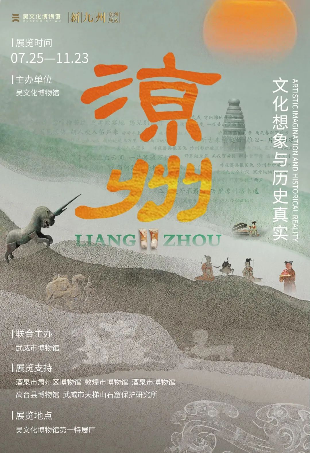 “葡萄美酒夜光杯,欲飲琵琶馬上催, 醉臥沙場(chǎng)君莫笑,古來(lái)征戰(zhàn)幾人回”。 唐朝詩(shī)人王翰的《涼州詞》 滿足了我們對(duì)于涼州 所有關(guān)于地域和文化方面的想象。 涼州,連接南北,溝通東西, 雜糅胡漢,融匯中外。 “涼州——文化想象與歷史真實(shí)”特展甄選了3個(gè)地市、6家博物館共181套272件文物,由吳文化博物館和武威市博物館聯(lián)合主辦,酒泉市肅州區(qū)博物館、敦煌市博物館、酒泉市博物館、高臺(tái)縣博物館 、武威市天梯山石窟保護(hù)研究所大力支持。展覽由金螳螂文化設(shè)計(jì)實(shí)施。 △ 7月25日,特展開幕式現(xiàn)場(chǎng) 本次“涼州——文化想象與歷史真實(shí)”特展,即是“新九州”系列展的第四期。 展覽分為“早期東西交流前沿”“河西四郡:涼州的‘第一塊拼圖’”“五百年間延綿一脈”“涼州七里十萬(wàn)家”“瀚海明珠:西夏輔郡”“西風(fēng)漫卷:詩(shī)思入涼州”六個(gè)單元展開敘述,力圖通過恢宏的歷史與真實(shí)敘述的視角,帶給觀眾無(wú)比豐富的文化想象空間。 涼州,這個(gè)想象力肆意迸發(fā)之所,曾是漢唐雄風(fēng)的邊陲重鎮(zhèn),亦是胡漢交融的文明樞紐,它以蒼茫的地理坐標(biāo),錨定了華夏文明向西拓進(jìn)的壯闊史詩(shī)。吳地文化以其細(xì)膩、靈動(dòng)的特質(zhì),與涼州的豪邁、雄渾形成鮮明對(duì)比,這種差異,為我們提供了更廣闊的交流空間與更深邃的文化思考。 在歷史長(zhǎng)河中,吳地與涼州雖相隔千里,卻通過絲綢之路等交流通道,相互影響、相互借鑒,不僅促進(jìn)了兩地的共同發(fā)展,也為中華文化注入了新的活力。 從漢代的“河西四郡”到隋唐的“西域四郡”“安西四鎮(zhèn)”,可以說(shuō)漢唐氣象半在河西,以涼州為最;及至宋元,黨項(xiàng)與蒙古的入駐為河西文化注入新的血液;降至明清,隨著絲綢之路的逐漸衰落,涼州也從對(duì)外開放的門戶變作控馭西陲的要沖。 撫今追昔,在追慕漢唐磅礴浪漫的光榮與夢(mèng)想時(shí),涼州始終是寄托美好想象的重要承載。 涼州不僅是華夏視野中的文化昌盛之地 也是漢唐磅礴浪漫的 光榮與夢(mèng)想的重要載體 觸摸涼州跳動(dòng)的脈搏 品嘗它千年的滋味 聆聽那些被風(fēng)沙打磨過的傳奇故事 走,去涼州,讓想象力飛一會(huì)兒! 特 展 信 息 展覽名稱:涼州——文化想象與歷史真實(shí) 展覽時(shí)間:2025.07.25-2025.11.23 展覽地點(diǎn):吳文化博物館一樓第一特展廳